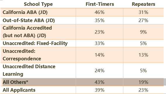 加州BAR也為大家整理出依照法學院類型來分類的考試通過率,請參考下列表格:- 總共有4,701人完成考試