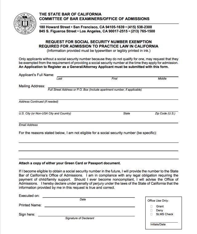 而沒有美國的社會安全碼,必須要索取SSN豁免的申請表格,然後將郵件寄到admissions.la@calbar.ca.gov,就可以獲得SSN的SSN豁免的最新申請表格了。