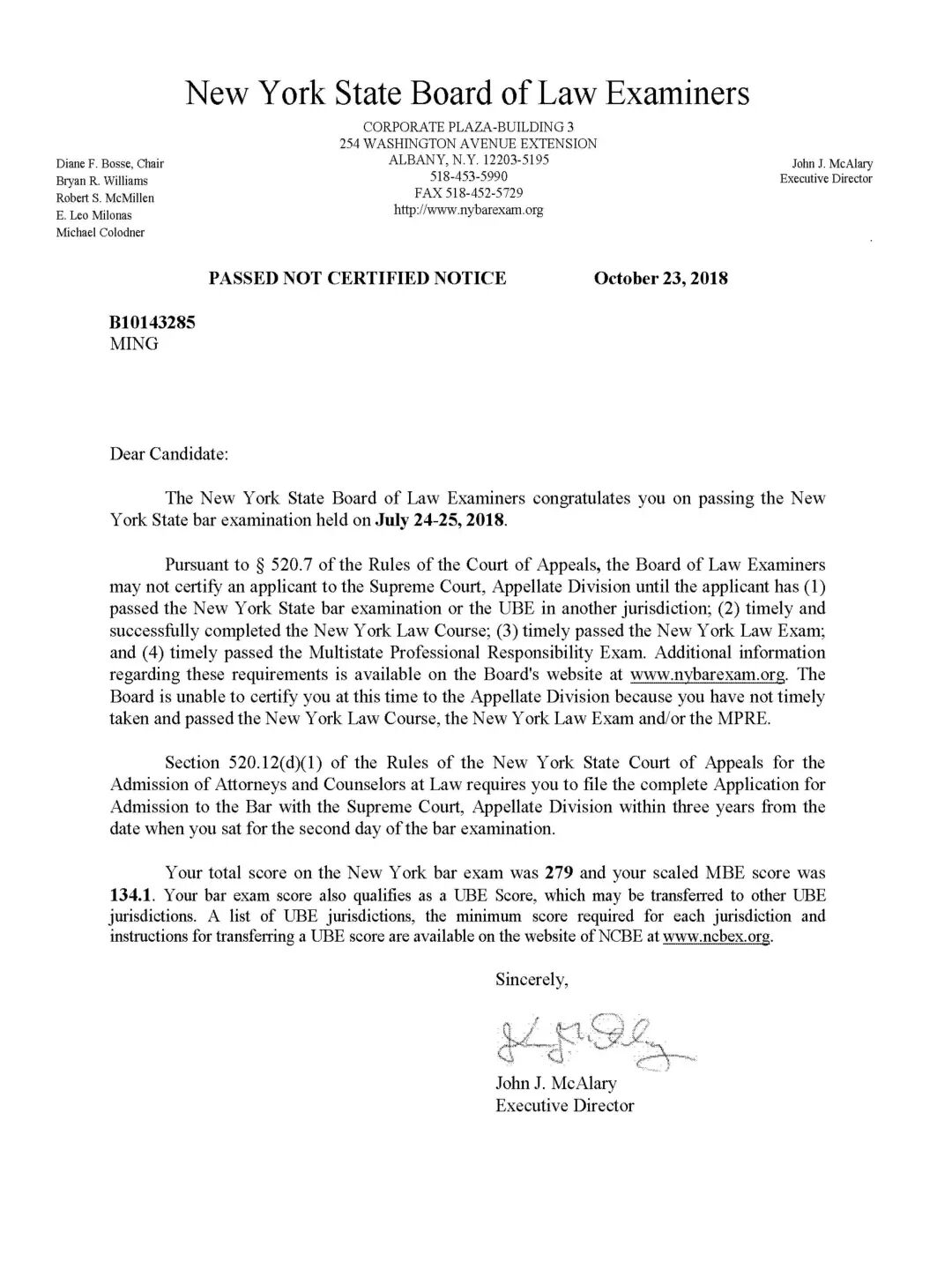 考完感覺還不錯,感覺有希望。接下來就開始了漫長了等待成績環節。最終成績總分為279,不高,但是過了啊!MBE 134.1分,其實只比第一次考多了不到6分。但是寫作高了很多,達到了145.9,成績一下就拉上去了。開心喲!